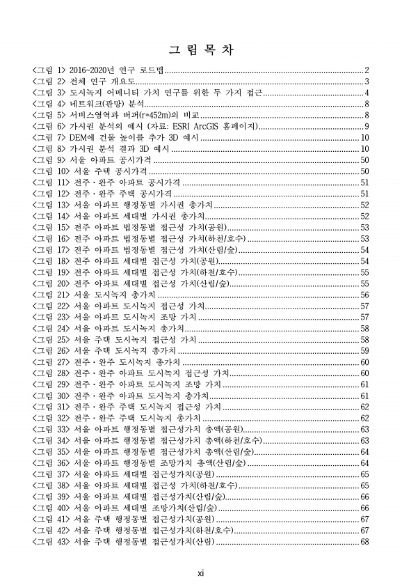 xi 그 림 목 차 그림 1 20162020년 연구 로드맵.........................................................................................2 그림 2 전체 연구 개요도......................................................................................................3 그림 3 도시녹지 어메니티 가치 연구를 위한 두 가지 접근.............................................4 그림 4 네트워크 관망 분석....................................................................