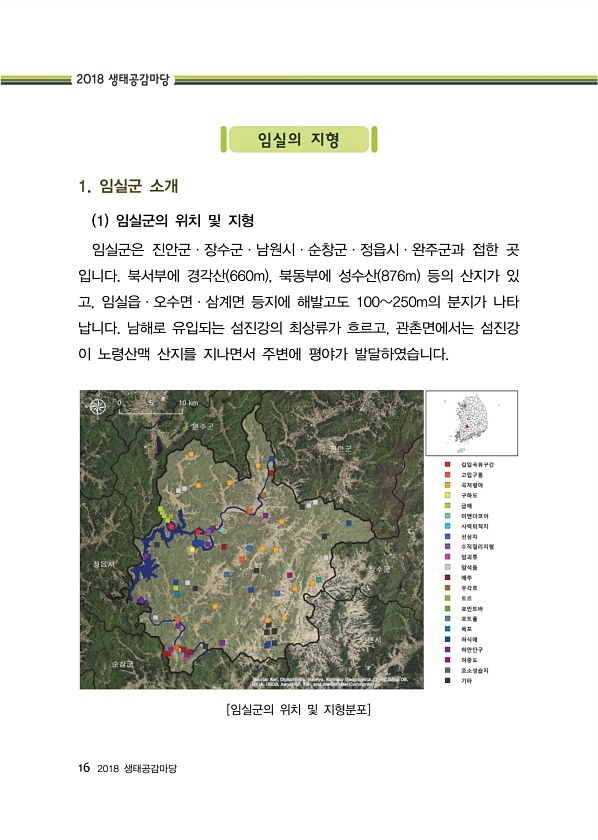16 2018 생태공감마당 임실의 지형 1. 임실군 소개 1 임실군의 위치 및 지형 임실군은 진안군·장수군·남원시·순창군·정읍시·완주군과 접한 곳 입니다. 북서부에 경각산 660m , 북동부에 성수산 876m 등의 산지가 있 고, 임실읍·오수면·삼계면 등지에 해발고도 100250m의 분지가 나타 납니다. 남해로 유입되는 섬진강의 최상류가 흐르고, 관촌면에서는 섬진강 이 노령산맥 산지를 지나면서 주변에 평야가 발달하였습니다. [임실군의 위치 및지형분포]