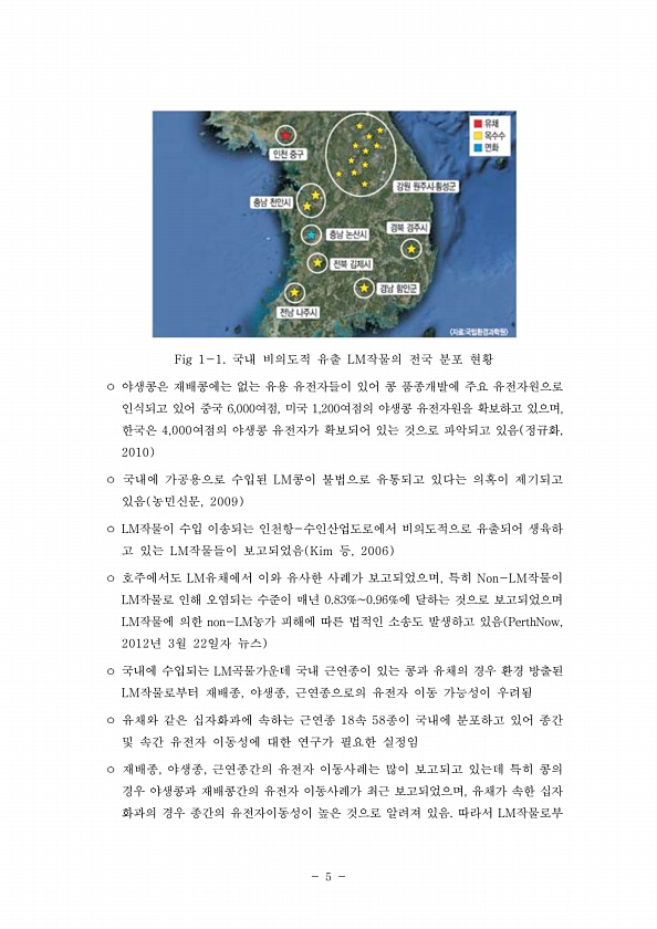 5 Fig 1-1. 국내 비의도적 유출 LM작물의 전국 분포 현황 ㅇ 야생콩은 재배콩에는 없는 유용 유전자들이 있어 콩 품종개발에 주요 유전자원으로 인식되고 있어 중국 6,000여점, 미국 1,200여점의 야생콩 유전자원을 확보하고 있으며, 한국은 4,000여점의 야생콩 유전자가 확보되어 있는 것으로 파악되고 있음 정규화, 2010 ㅇ 국내에 가공용으로 수입된 LM콩이 불법으로 유통되고 있다는 의혹이 제기되고 있음 농민신문, 2009 ㅇ LM작물이 수입 이송되는 인천항-수인산업도로에서 비의도적으로 유출되어 생육하 고 있는 LM작물들이 보고되었음 Kim 등, 2006 ㅇ 호주에서도 LM유채에서 이와 유사한 사례가 보고되었으며, 특히 Non-LM작물이 LM작물로 인해 오염되는 수준이 매년 0.83%0.96%에 ...