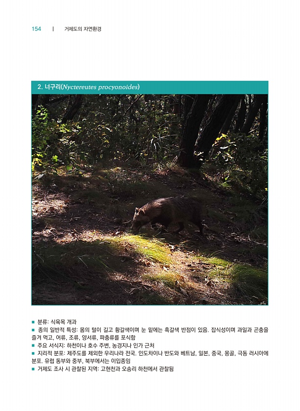154 ┃ 거제도의 자연환경 2. 너구리 Nyctereutes procyonoides ■ 분류식육목 개과 ■ 종의 일반적 특성몸의 털이 길고 황갈색이며 눈 밑에는 흑갈색 반점이 있음. 잡식성이며 과일과 곤충을 즐겨 먹고, 어류, 조류, 양서류, 파충류를 포식함 ■ 주요 서식지하천이나 호수 주변, 농경지나 인가 근처 ■ 지리적 분포제주도를 제외한 우리나라 전국. 인도차이나 반도와 베트남, 일본, 중국, 몽골, 극동 러시아에 분포. 유럽 동부와 중부, 북부에서는 이입종임 ■ 거제도 조사 시 관찰된 지역고현천과 오송리 하천에서관찰됨