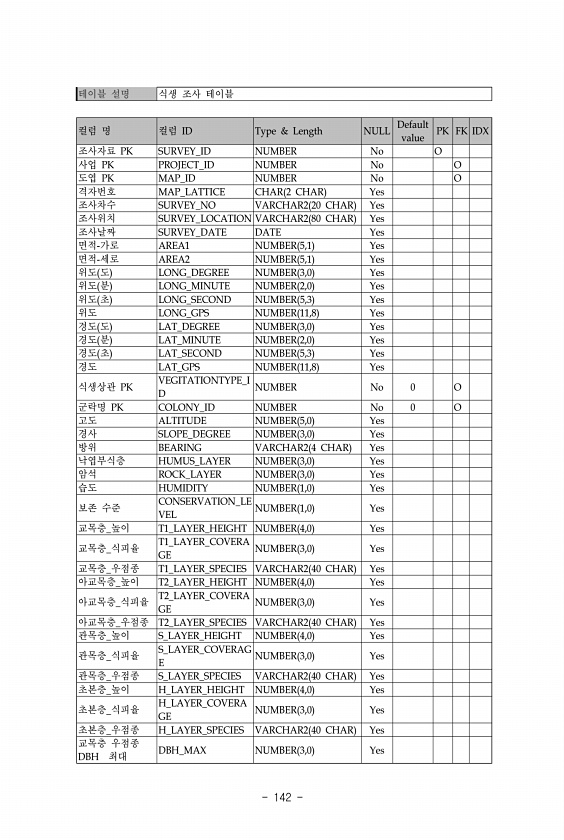 142 테이블 설명 식생 조사 테이블 컬럼 명 컬럼 ID Type & Length NULL Default value PK FK IDX 조사자료 PK SURVEY_ID NUMBER No O 사업 PK PROJECT_ID NUMBER No O 도엽 PK MAP_ID NUMBER No O 격자번호 MAP_LATTICE CHAR 2 CHAR Yes 조사차수 SURVEY_NO VARCHAR2 20 CHAR Yes 조사위치 SURVEY_LOCATION VARCHAR2 80 CHAR Yes 조사날짜 SURVEY_DATE DATE Yes 면적-가로 AREA1 NUMBER 5,1 Yes 면적-세로 AREA2 NUMBER 5,1 Yes 위도 도 LONG_DEGREE NUMBER 3,0 Yes 위도 분 LONG_MINUTE N...