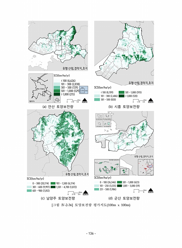 a 안산 토양보전량 b 시흥 토양보전량 c 남양주 토양보전량 d 군산 토양보전량 [그림 Ⅳ-2-36] 토양보전량 평가지도 100m x 100m 136