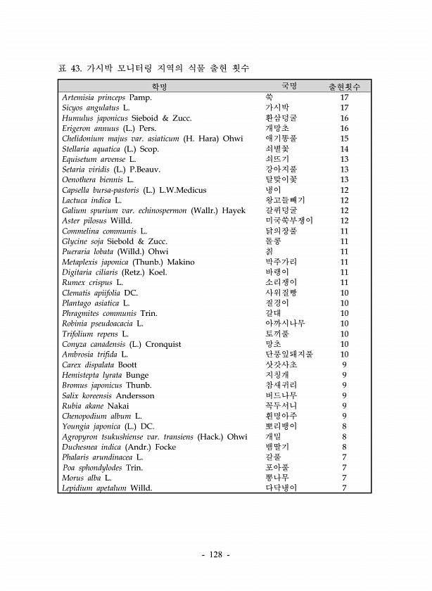 128 학명 국명 출현횟수 Artemisia princeps Pamp. 쑥 17 Sicyos angulatus L. 가시박 17 Humulus japonicus Sieboid & Zucc. 환삼덩굴 16 Erigeron annuus L. Pers. 개망초 16 Chelidonium majus var. asiaticum H. Hara Ohwi 애기똥풀 15 Stellaria aquatica L. Scop. 쇠별꽃 14 Equisetum arvense L. 쇠뜨기 13 Setaria viridis L. P.Beauv. 강아지풀 13 Oenothera biennis L. 달맞이꽃 13 Capsella bursa-pastoris L. L.W.Medicus 냉이 12 Lactuca indica L. 왕고들빼기 12 ...