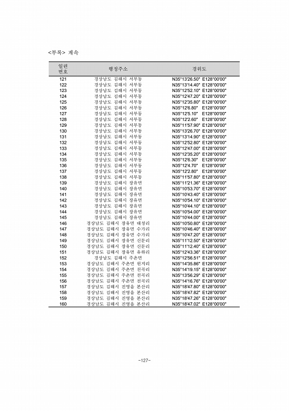 -127- 부록 계속 일련 번호 행정주소 경위도 121 경상남도 김해시 서부동 N35°1326.50E128°0000122 경상남도 김해시 서부동 N35°1314.40E128°0000123 경상남도 김해시 서부동 N35°1252.10E128°0000124 경상남도 김해시 서부동 N35°1247.20E128°0000125 경상남도 김해시 서부동 N35°1235.80E128°0000126 경상남도 김해시 서부동 N35°126.80E128°0000127 경상남도 김해시 서부동 N35°125.10E128°0000128 경상남도 김해시 서부동 N35°122.60E128°0000129 경상남도 김해시 서부동 N35°1157.90E128°0000130 경상남도 김해시 서부동 N35°1326.70E128°0000131 경상...
