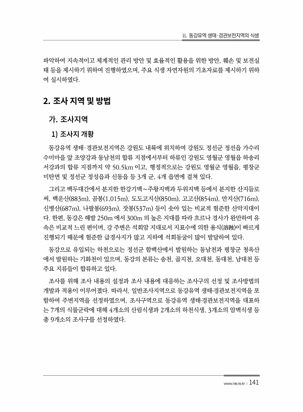 ii. 동강유역 생태·경관보전지역의 식생 www.nie.re.kr ?141 파악하여 지속적이고 체계적인 관리 방안 및 효율적인 활용을 위한 방안, 훼손 및 보전실 태 등을 제시하기 위하여 진행하였으며, 주요 식생 자연자원의 기초자료를 제시하기 위하 여 실시하였다. 2. 1 동강유역 생태·경관보전지역은 강원도 내륙에 위치하여 강원도 정선군 정선읍 가수리 수미마을 앞 조양강과 동남천의 합류 지점에서부터 하류인 강원도 영월군 영월읍 하송리 서강과의 합류 지점까지 약 50.5km 이고, 행정적으로는 강원도 영월군 영월읍, 평창군 미탄면 및 정선군 정성읍과 신동읍 등 3개 군, 4개 읍면에 걸쳐 있다. 그리고 백두대간에서 분지한 한강기맥∼주왕지맥과 두위지맥 등에서 분지한 산지들로 써, 백운산 883m , 곰봉 1,0...