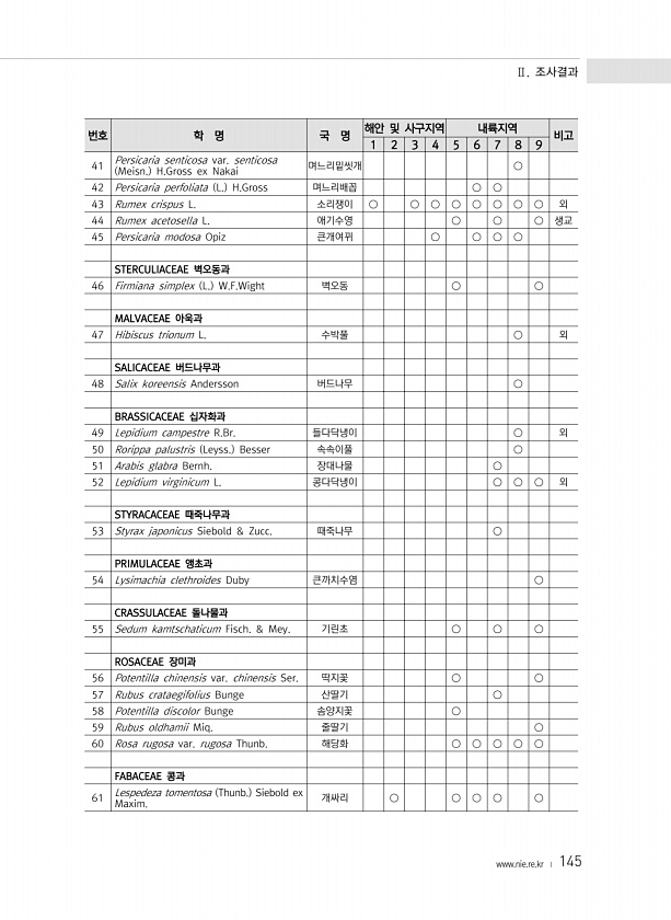 Ⅱ. 조사결과 www.nie.re.kr ? 145 번호 학 명 국 명 해안 및 사구지역 내륙지역 비고 1 2 3 4 5 6 7 8 9 41 Persicaria senticosa var. senticosa Meisn. H.Gross ex Nakai 며느리밑씻개 ○ 42 Persicaria perfoliata L. H.Gross 며느리배꼽 ○ ○ 43 Rumex crispus L. 소리쟁이 ○ ○ ○ ○ ○ ○ ○ ○ 외 44 Rumex acetosella L. 애기수영 ○ ○ ○ 생교 45 Persicaria modosa Opiz 큰개여뀌 ○ ○ ○ ○ STERCULIACEAE 벽오동과 46 Firmiana simplex L. W.F.Wight 벽오동 ○ ○ MALVACEAE 아욱과 47 Hibiscus tr...