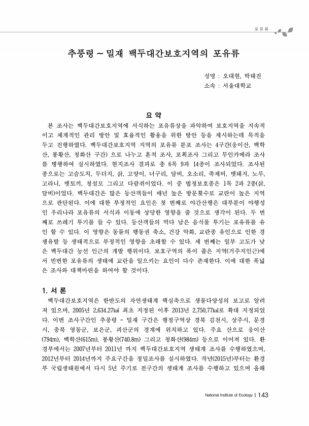 포 유 류 National Institute of EcologyⅠ143 추풍령 밀재 백두대간보호지역의 포유류 성명 오대현, 박태진 소속 서울대학교 요 약 본 조사는 백두대간보호지역에 서식하는 포유류상을 파악하여 보호지역을 지속적 이고 체계적인 관리 방안 및 효율적인 활용을 위한 방안 등을 제시하는데 목적을 두고 진행하였다. 백두대간보호지역 지역의 포유류 분포 조사는 4구간 웅이산, 백학 산, 봉황산, 청화산 구간 으로 나누고 흔적 조사, 포획조사 그리고 무인카메라 조사 를 병행하여 실시하였다. 현지조사 결과로 총 6목 9과 14종이 조사되었다. 조사된 종으로는 고슴도치, 두더지, 삵, 고양이, 너구리, 담비, 오소리, 족제비, 멧돼지, 노루, 고라니, 멧토끼, 청설모 그리고 다람쥐이었다. 이 중 법정보호종은...