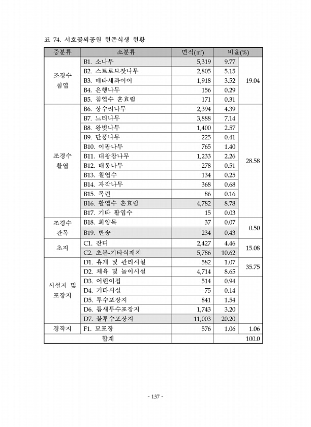 137 중분류 소분류 면적 비율 조경수 침엽 소나무 스트로브잣나무 메타세콰이어 은행나무 침엽수 혼효림 조경수 활엽 상수리나무 느티나무 왕벚나무 단풍나무 이팝나무 대왕참나무 배롱나무 칠엽수 자작나무 목련 활엽수 혼효림 기타 활엽수 조경수 관목 회양목 반송 초지 잔디 초본 기타식재지 시설지 및 포장지 휴게 및 관리시설 체육 및 놀이시설 어린이집 기타시설 투수포장지 틈새투수포장지 불투수포장지 경작지 묘포장 합계 표 서호꽃뫼공원 현존식생 현황 137