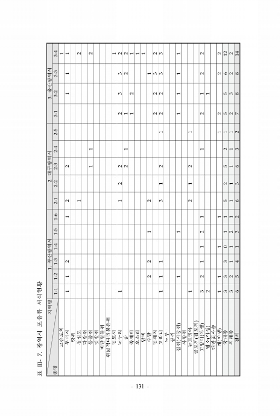 표 Ⅲ- 7. 광역시 포유류 서식현황 지역명 종명 1. 부산광역시 2. 대구광역시 3. 울산광역시 1-1 1-2 1-3 1-4 1-5 1-6 2-1 2-2 2-3 2-4 2-5 3-1 3-2 3-3 3-4 고슴도치 1 두더지 1 1 2 1 2 2 1 1 1 땃쥐 청설모 1 2 다람쥐 등줄쥐 1 1 2 멧밭쥐 비단털들쥐 흰넓적다리붉은쥐 멧토끼 1 너구리 1 1 2 2 2 3 3 2 삵 2 1 1 2 2 족제비 1 2 1 오소리 1 담비 1 수달 2 2 1 2 1 멧돼지 2 2 3 2 고라니 1 1 1 3 1 2 1 2 2 3 3 노루 곰쥐 집쥐 시궁쥐 1 1 1 1 1 1 사향쥐 뉴트리아 1 2 1 2 1 굴토끼 집토끼 고양이 야생 3 2 1 1 2 1 1 2 1 2 2 염소 야생 2 1 대만꽃사슴 개 야생 ...