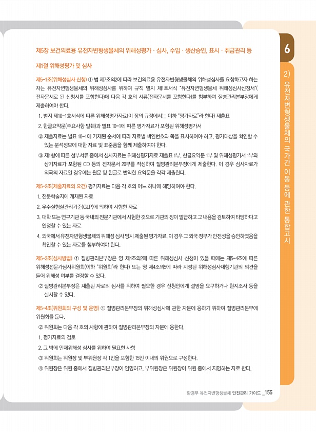 환경부 유전자변형생물체 안전관리 가이드 _155 6 유전자변형생물체의 국가간 이동 등에 관한 통합고시 2 제5장 보건의료용 유전자변형생물체의 위해성평가·심사, 수입·생산승인, 표시·취급관리 등 제1절 위해성평가 및 심사 제5-1조 위해성심사 신청 ① 법 제7조의2에 따라 보건의료용 유전자변형생물체의 위해성심사를 요청하고자 하는 자는 유전자변형생물체의 위해성심사를 위하여 규칙 별지 제1호서식 “유전자변형생물체 위해성심사신청서” 전자문서로 된 신청서를 포함한다 에 다음 각 호의 서류 전자문서를 포함한다 를 첨부하여 질병관리본부장에게 제출하여야 한다. 1. 별지 제10-1호서식에 따른 위해성평가자료 이 장의 규정에서는 이하 “평가자료”라 한다 제출표 2. 한글요약문 주요사항 발췌 과 별표 10-1에 따른 평가자료...