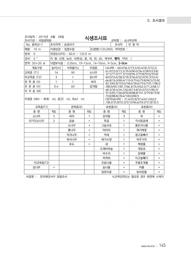 Ⅱ. 조사결과 www.nie.re.kr ? 145 조사일자 2015년 8월 28일 조사기관 국립생태원 식생조사표 군락명 소나무군락 No. 중측선-7 조사지역 송정사구 조사자 민 병 미 해발10 m 식생상관 침엽수림 도엽명 1/25,000 , 격자번호 방위0 위경도 GPS 82.0 132.0 m 경사0 ° 지 형산정, 능선, 사면 상, 중, 하, 凹, 凸 , 계곡부, 평지, 기타 면적50×20 ㎡ 낙엽부식층 ≥20cm, 19-15cm, 14-10cm, 9-5cm, 5-0cm 계층구분 높이 m 식피율 % 우점종 소나무 60.0/56.5/73.5/45.0/20.3/72.2/ 61.0/55.0/15.5/76.0/60.0/54.2/58.0/23.8/ 37.5/77.0/77.3/53.8/94.2/79.8/93.6/59...