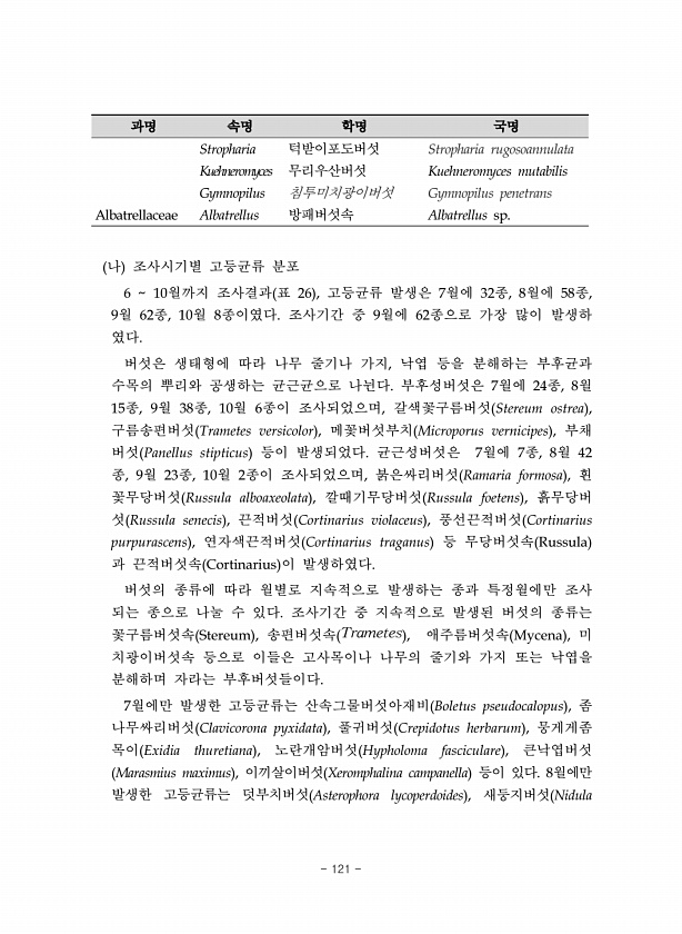 과명 속명 학명 국명 Stropharia 턱받이포도버섯 Stropharia rugosoannulata Kuehneromyces 무리우산버섯 Kuehneromyces mutabilis Gymnopilus 침투미치광이버섯 Gymnopilus penetrans Albatrellaceae Albatrellus 방패버섯속 Albatrellus sp. 나 조사시기별 고등균류 분포 6 10월까지 조사결과 표 26 , 고등균류 발생은 7월에 32종, 8월에 58종, 9월 62종, 10월 8종이였다. 조사기간 중 9월에 62종으로 가장 많이 발생하 였다. 버섯은 생태형에 따라 나무 줄기나 가지, 낙엽 등을 분해하는 부후균과 수목의 뿌리와 공생하는 균근균으로 나뉜다. 부후성버섯은 7월에 24종, 8월 15종, 9월 38종, ...