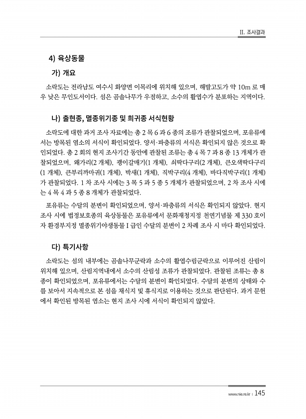 II. 조사결과 www.nie.re.kr ?145 4 소락도는 전라남도 여수시 화양면 이목리에 위치해 있으며, 해발고도가 약 10m 로 매 우 낮은 무인도서이다. 섬은 곰솔나무가 우점하고, 소수의 활엽수가 분포하는 지역이다. , 소락도에 대한 과거 조사 자료에는 총 2 목 6 과 6 종의 조류가 관찰되었으며, 포유류에 서는 방목된 염소의 서식이 확인되었다. 양서·파충류의 서식은 확인되지 않은 것으로 확 인되었다. 총 2 회의 현지 조사기간 동안에 관찰된 조류는 총 4 목 7 과 8 종 13 개체가 관 찰되었으며, 왜가리 2 개체 , 괭이갈매기 1 개체 , 쇠딱다구리 2 개체 , 큰오색딱다구리 1 개체 , 큰부리까마귀 1 개체 , 박새 1 개체 , 직박구리 4 개체 , 바다직박구리 1 개체 가 관찰되었다. 1...