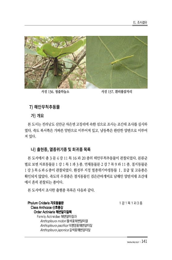 II. 조사결과 www.nie.re.kr ?141 사진 136. 청줄하늘소 사진 137. 흰띠풀잠자리 7 본 도서는 전라남도 신안군 자은면 고장리에 속한 섬으로 조사는 조간대 조사를 실시하 였다. 죽도 북서쪽은 가파른 암반으로 이루어져 있고, 남동쪽은 완만한 암반으로 이루어 져 있다. , 본 도서에서 총 3 문 4 강 11 목 16 과 20 종의 해안무척추동물이 관찰되었다. 분류군 별로 보면 자포동물문 1 강 1 목 1 과 3 종, 연체동물문 2 강 7 목 9 과 11 종, 절지동물문 1 강 3 목 6 과 6 종이 관찰되었다. 환경부 지정 멸종위기야생동물 Ⅰ, Ⅱ급 및 고유종은 확인되지 않았다. 죽도의 우점종은 절지동물인 검은큰따개비로 남해안 암반지대 조간대 에서 흔히 관찰되는 종이다. 본 도서에서 조사한 ...