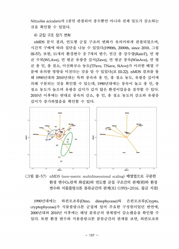 127 Nitzschia acicularis의 1종만 관찰되어 종수뿐만 아니라 전체 밀도가 감소하는 것을 확인할 수 있었다. 4 군집 구조 장기 변화 nMDS 분석 결과, 연도별 군집 구조의 변화가 유의미하게 관찰되었으며, 시간적 구배에 따라 집단을 나눌 수 있었다 1990th, 2000th, since 2010, 그림 III-57 또한, 11개의 환경변수 중 7개의 변수, 연간 총 강수량 RainT , 연 평 균 수위 WLAve , 연 평균 유광층 깊이 Zave , 연 평균 풍속 WinAve , 연 평 균 총 인, 총 질소, 이산화규소 농도 TPave, TNave, SiAve 가 이러한 배열 구 분에 유의한 영향을 미친다는 것을 알 수 있었다 표 III-22 nMDS 결과를 통 해 1990년대와 2010년...