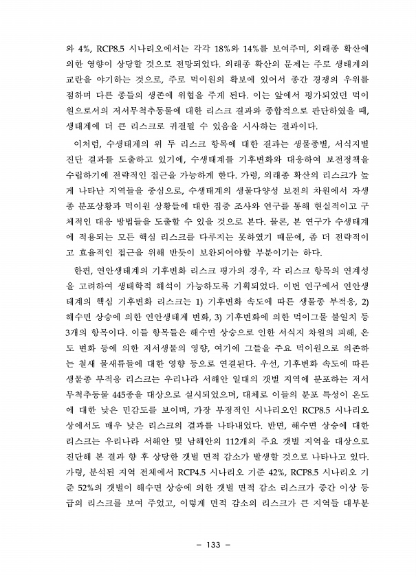 133 와 4%, RCP8.5 시나리오에서는 각각 18%와 14%를 보여주며, 외래종 확산에 의한 영향이 상당할 것으로 전망되었다. 외래종 확산의 문제는 주로 생태계의 교란을 야기하는 것으로, 주로 먹이원의 확보에 있어서 종간 경쟁의 우위를 점하며 다른 종들의 생존에 위협을 주게 된다. 이는 앞에서 평가되었던 먹이 원으로서의 저서무척추동물에 대한 리스크 결과와 종합적으로 판단하였을 때, 생태계에 더 큰 리스크로 귀결될 수 있음을 시사하는 결과이다. 이처럼, 수생태계의 위 두 리스크 항목에 대한 결과는 생물종별, 서식지별 진단 결과를 도출하고 있기에, 수생태계를 기후변화와 대응하여 보전정책을 수립하기에 전략적인 접근을 가능하게 한다. 가령, 외래종 확산의 리스크가 높 게 나타난 지역들을 중심으로, 수생태계의 ...