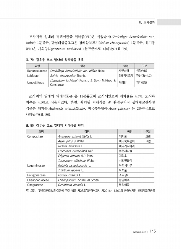 Ⅱ. 조사결과 www.nie.re.kr ? 145 조사지역 일대의 적색식물중 취약종 VU 은 세잎승마 Cimicifuga heracleifolia var. bifida 1분류군, 관심대상종 LC 은 참배암차즈기 Salvia chanryonica 1분류군, 위기종 EN 은 개회향 Ligusticum tachiroei 1분류군으로 나타났다 표 79 표 79. 감우골 코스 일대의 적색식물 목록 과명 학명 국명 구분 Ranunculaceae Cimicifuga heracleifolia var. bifida Nakai 세잎승마 취약 VU Labiatae Salvia chanryonica Thunb. 참배암차즈기 관심대상 LC Umbelliferae Ligusticum tachiroei Franch. & Sav. M....