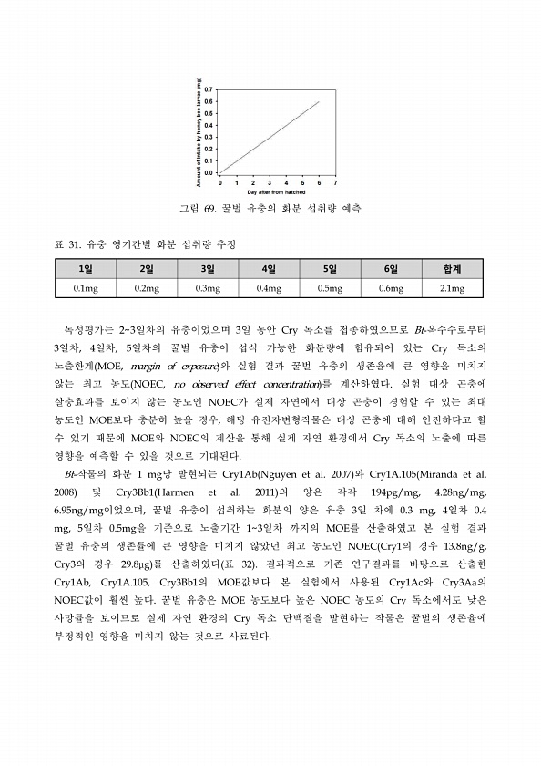 그림 69. 꿀벌 유충의 화분 섭취량 예측 표 31. 유충 영기간별 화분 섭취량 추정 1일 2일 3일 4일 5일 6일 합계 0.1mg 0.2mg 0.3mg 0.4mg 0.5mg 0.6mg 2.1mg 독성평가는 23일차의 유충이었으며 3일 동안 Cry 독소를 접종하였으므로 Bt-옥수수로부터 3일차, 4일차, 5일차의 꿀벌 유충이 섭식 가능한 화분량에 함유되어 있는 Cry 독소의 노출한계 MOE, margin of exposure 와 실험 결과 꿀벌 유충의 생존율에 큰 영향을 미치지 않는 최고 농도 NOEC, no observed effect concentration 를 계산하였다. 실험 대상 곤충에 살충효과를 보이지 않는 농도인 NOEC가 실제 자연에서 대상 곤충이 경험할 수 있는 최대 농도인 MOE보다 충분...