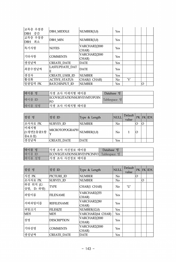 143 교목층 우점종 DBH 중간 DBH_MIDDLE NUMBER 3,0 Yes 교목층 우점종 DBH 최소 DBH_MIN NUMBER 3,0 Yes 특기사항 NOTES VARCHAR2 2000 CHAR Yes 기타사항 COMMENTS VARCHAR2 2000 CHAR Yes 생성날짜 CREATE_DATE DATE Yes 최종수정날짜 LASTUPDATE_DAT E DATE Yes 생성자 CREATE_USER_ID NUMBER Yes 활성화 ACTIVE_STATUS CHAR 1 CHAR No Y일괄입력 PK BATCHINPUT_ID NUMBER Yes O 테이블 명 식생 조사 미세지형 테이블 Database 명 테이블 ID ECOVEGITATIONSURVEYMTOPOIN FO Tablespace 명 테이블 설명...