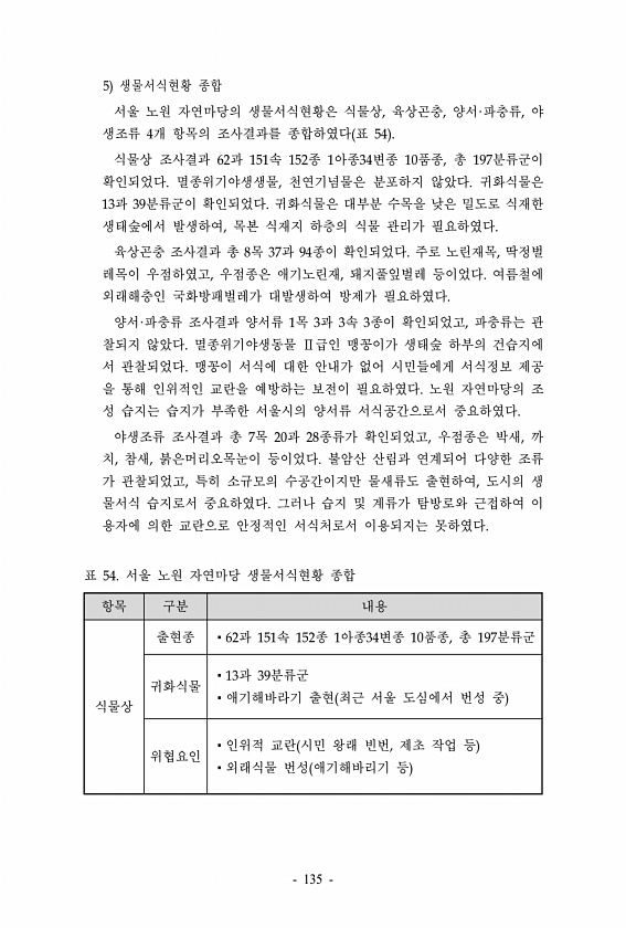 5 생물서식현황 종합 서울 노원 자연마당의 생물서식현황은 식물상, 육상곤충, 양서·파충류, 야 생조류 4개 항목의 조사결과를 종합하였다 표 54 식물상 조사결과 62과 151속 152종 1아종34변종 10품종, 총 197분류군이 확인되었다. 멸종위기야생생물, 천연기념물은 분포하지 않았다. 귀화식물은 13과 39분류군이 확인되었다. 귀화식물은 대부분 수목을 낮은 밀도로 식재한 생태숲에서 발생하여, 목본 식재지 하층의 식물 관리가 필요하였다. 육상곤충 조사결과 총 8목 37과 94종이 확인되었다. 주로 노린재목, 딱정벌 레목이 우점하였고, 우점종은 애기노린재, 돼지풀잎벌레 등이었다. 여름철에 외래해충인 국화방패벌레가 대발생하여 방제가 필요하였다. 양서·파충류 조사결과 양서류 1목 3과 3속 3종이 확인되었고, ...