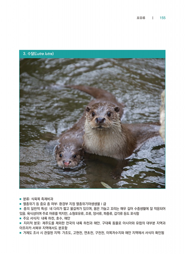 포유류 ┃ 155 3. 수달 Lutra lutra ■ 분류식육목 족제비과 ■ 멸종위기 등 중요 종 여부환경부 지정 멸종위기야생생물Ⅰ급 ■ 종의 일반적 특성네 다리가 짧고 물갈퀴가 있으며, 몸은 가늘고 꼬리는 매우 길어 수중생활에 잘 적응되어 있음. 육식성이며 주로 어류를 먹지만, 소형포유류, 조류, 양서류, 파충류, 갑각류 등도 포식함 ■ 주요 서식지내륙 하천, 호수, 해안 ■ 지리적 분포제주도를 제외한 전국의 내륙 하천과 해안. 구대륙 동물로 아시아와 유럽의 대부분 지역과 아프리카 서북부 지역에서도 분포함 ■ 거제도 조사 시 관찰된 지역가조도, 고현천, 연초천, 구천천, 이목저수지와 해안 지역에서 서식이확인됨