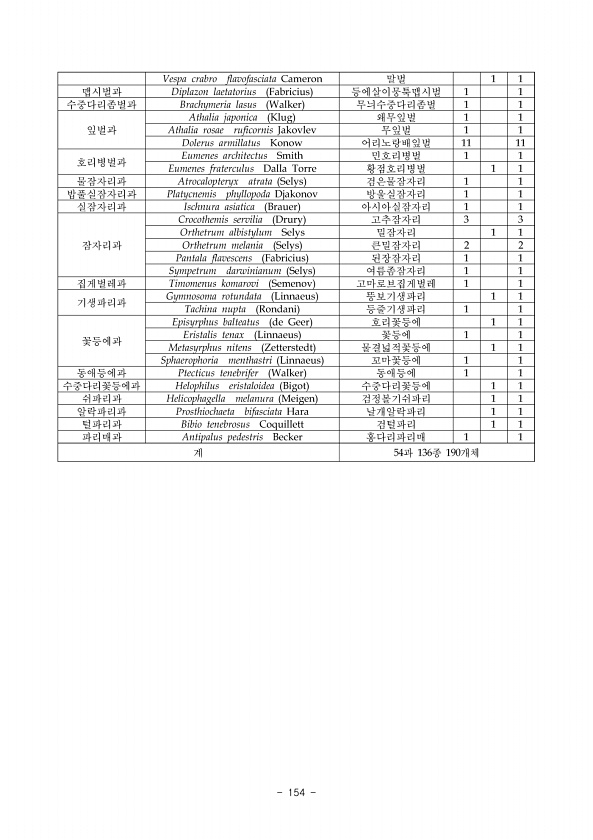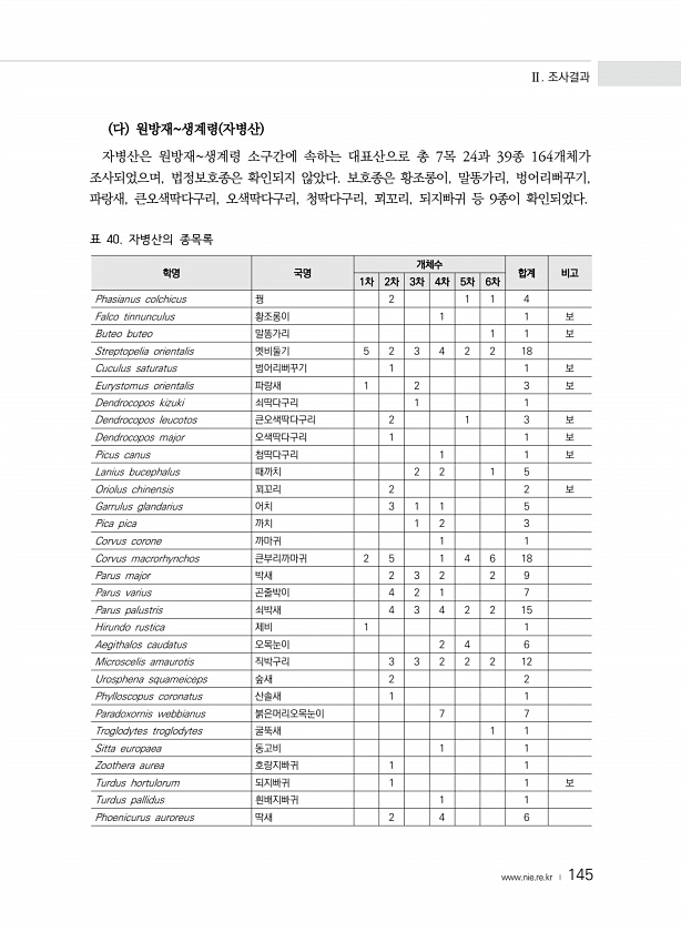 Ⅱ. 조사결과 www.nie.re.kr ? 145 학명 국명 개체수 합계 비고 1차 2차 3차 4차 5차 6차 Phasianus colchicus 꿩 2 1 1 4 Falco tinnunculus 황조롱이 1 1 보 Buteo buteo 말똥가리 1 1 보 Streptopelia orientalis 멧비둘기 5 2 3 4 2 2 18 Cuculus saturatus 벙어리뻐꾸기 1 1 보 Eurystomus orientalis 파랑새 1 2 3 보 Dendrocopos kizuki 쇠딱다구리 1 1 Dendrocopos leucotos 큰오색딱다구리 2 1 3 보 Dendrocopos major 오색딱다구리 1 1 보 Picus canus 청딱다구리 1 1 보 Lanius bucephalus 때까치 2 2 ...