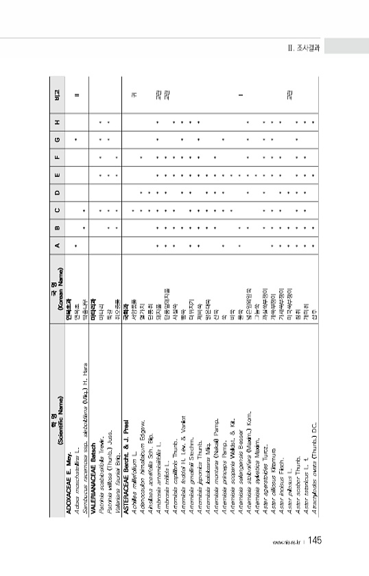 www ·nie·re·kr ? 145 학 명 Scientific Name 국 명 Korean Name A B C D E F G H 비고 ADOXACEAE E. Mey. 연복초과 Adoxa moschatellina L. 연복초 * * Ⅱ Sambucus racemosa ssp. sieboldiana Miq. H. Hara 딱총나무 * * VALERIANACEAE Batsch 마타리과 Patrinia scabiosifolia Trevir. 마타리 * * * * * Patrinia villosa Thunb. Juss. 뚝갈 * * * * * Valeriana fauriei Briq. 쥐오줌풀 * * * * ASTERACEAE Bercht. & J. Presl 국화과 Achillea millefolium L. 서양...