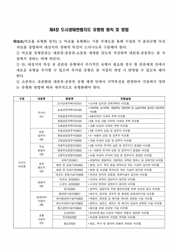 제4장 도시생태현황지도 유형화 원칙 및 방법 제18조 비오톱 유형화 원칙 ① 비오톱 유형화는 기본 주제도를 통해 수집된 각 폴리곤별 속성 자료를 종합하여 대상지의 생태적 특성이 드러나도록 구분해야 한다. ② 비오톱 유형분류는 대분류-중분류-소분류 체계를 갖도록 작성하며 대분류-중분류는 본 지 침에서 정하는 바에 따른다. ③ 단, 대상지의 특성 상 중분류 유형에서 추가적인 유형이 필요한 경우 현 분류체계 안에서 새로운 유형을 추가할 수 있으며 추가된 유형은 본 지침의 개정 시 반영될 수 있도록 해야 한다. ④ 소분류는 표준화된 대분류-중분류 유형 체계 안에서 지역특성을 반영하여 지침에서 정하 는 유형화 방법에 따라 세부적으로 유형화해야 한다. 구분 대분류 중분류 유형설명 시가지 비오톱 주거지 01 도시단독주택...