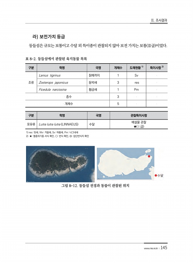 II. 조사결과 www.nie.re.kr ?145 둥들섬은 규모는 보통이고 수달 외 특이종이 관찰되지 않아 보전 가치는 보통 Ⅱ급 이었다. 구분 학명 국명 개체수 도래현황 1 특이사항 2 조류 Lanius tigrinus 칡때까치 1 Sv Zosterops japonicus 동박새 3 res Ficedula narcissina 황금새 1 Pm 종수 3 개체수 5 표 8-2. 둥들섬에서 관찰된 육지동물 목록 구분 학명 국명 관찰특이사항 포유류 Lutra lutra lutra LINNAEUS 수달 배설물 관찰 ★ Ⅰ급 1 res텃새, Wv겨울새, Sv여름새, Pm나그네새 2 ★멸종위기종 서식 확인, ○번식 확인, ◎집단번식지 확인 그림 8-12. 둥들섬 전경과 동물이 관찰된위치