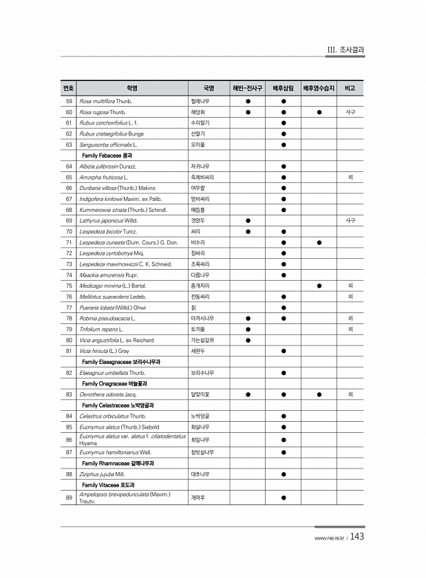 III. 조사결과 www.nie.re.kr ?143 번호 학명 국명 해빈-전사구 배후삼림 배후염수습지 비고 59 Rosa multiflora Thunb. 찔레나무 ● ● 60 Rosa rugosa Thunb. 해당화 ● ● ● 사구 61 Rubus corchorifolius L. f. 수리딸기 ● 62 Rubus crataegifolius Bunge 산딸기 ● 63 Sanguisorba officinalis L. 오이풀 ● Family Fabaceae 콩과 64 Albizia julibrissin Durazz. 자귀나무 ● 65 Amorpha fruticosa L. 족제비싸리 ● 외 66 Dunbaria villosa Thunb. Makino 여우팥 ● 67 Indigofera kirilowii Maxim....