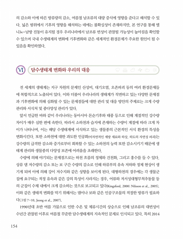 154 의 감소와 이에 따른 방류량의 감소, 여름철 남조류의 대량 증식에 영향을 준다고 해석할 수 있 다. 넓은 범위에서 기후의 영향을 해석하는 데에는 불확실성이 존재하지만, 본 연구를 통해 엘 니뇨-남방 진동이 유지될 경우 우리나라에서 남조류 번성이 관찰될 가능성이 높아짐을 확인할 수 있으며 국내 수생태계의 변화에 기후변화와 같은 세계적인 환경문제가 주요한 원인이 될 수 있음을 확인하였다. VI 담수생태계 변화와 우리의 대응 전 세계의 생태계는 지구 차원의 문제인 산성비, 대기오염, 오존파괴 등의 여러 환경문제들 에 복합적으로 노출되어 있다. 이와 더불어 우리나라의 생태계가 직면하고 있는 다양한 문제점 과 기후변화에 의해 심화될 수 있는 문제점들에 대한 관리 및 대응 방안의 주제로는 크게 수량 관리와 서식...