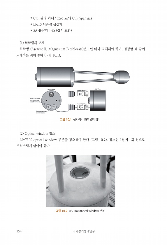 154 국가장기생태연구 * CO2 검정 기체 zero air와 CO2 Span gas * LI610 이슬점 생성기 * 5A 용량의 퓨즈 상시 교환 1 화학병의 교체 화학병 Ascarite II, Magnesium Perchlorate 은 1년 마다 교체해야 하며, 검정할 때 같이 교체하는 것이 좋다 그림 10.1 2 Optical window 청소 LI-7500 optical window 부분을 청소해야 한다 그림 10.2 청소는 1달에 1회 천으로 조심스럽게 닦아야 한다. 그림 10.1 센서에서 화학병의 위치. 그림 10.2 LI-7500 optical window부분.