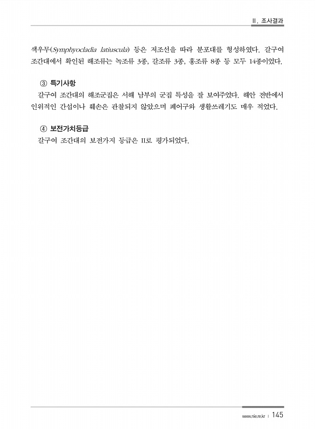 Ⅱ. 조사결과 www.nie.re.kr ? 145 색우무 Symphyocladia latiuscula 등은 저조선을 따라 분포대를 형성하였다. 갈구여 조간대에서 확인된 해조류는 녹조류 3종, 갈조류 3종, 홍조류 8종 등 모두 14종이었다. ③ 특기사항 갈구여 조간대의 해조군집은 서해 남부의 군집 특성을 잘 보여주었다. 해안 전반에서 인위적인 간섭이나 훼손은 관찰되지 않았으며 폐어구와 생활쓰레기도 매우 적었다. ④ 보전가치등급 갈구여 조간대의 보전가지 등급은 II로평가되었다.