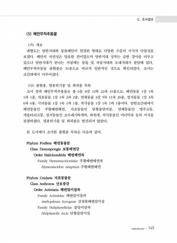 Ⅱ. 조사결과 www.nie.re.kr ? 145 5 해안무척추동물 가 개요 대혈도는 암반지대와 몽돌해안이 연결된 형태로 다양한 수준의 서식처 다양성을 보였다. 해안의 자연성은 양호한 편이었으며 암반지대 상부는 급한 경사를 이루고 있으나 암반지대가 끝나는 지점에는 몽돌 및 자갈지대와 모래지대가 발달해 있다. 해안무척추동물 출현종은 31종으로 비교적 일반적인 것으로 확인되었다. 조사는 조간대에서 이루어졌다. 나 출현종, 멸종위기종 및 희귀종 목록 조사 결과 해안무척추동물은 총 6문 8강 12목 22과 31종으로, 해면동물 1강 1목 1과 1종, 자포동물 1강 1목 2과 2종, 연체동물 3강 5목 11과 20종, 절지동물 1강 3목 6과 6종, 극피동물 1강 1목 1과 1종, 척삭동물 1강 1목 1과 1종이다....