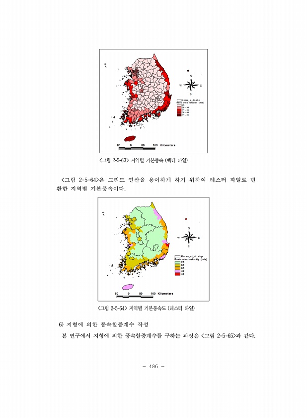 486 그림 2-5-63 지역별 기본풍속 벡터 파일 그림 2-5-64 은 그리드 연산을 용이하게 하기 위하여 레스터 파일로 변 환한 지역별 기본풍속이다. 그림 2-5-64 지역별 기본풍속도 레스터 파일 6 지형에 의한 풍속할증계수 작성 본 연구에서 지형에 의한 풍속할증계수를 구하는 과정은 그림 2-5-65 과같다.