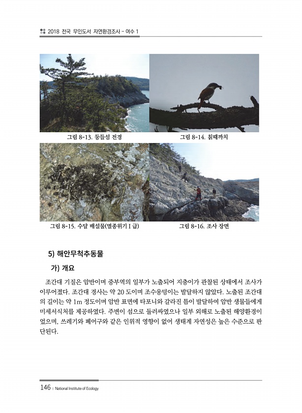 2018 전국 무인도서 자연환경조사 여수 1 146 ? National Institute of Ecology 5 조간대 기질은 암반이며 중부역의 일부가 노출되어 지충이가 관찰된 상태에서 조사가 이루어졌다. 조간대 경사는 약 20 도이며 조수웅덩이는 발달하지 않았다. 노출된 조간대 의 길이는 약 1m 정도이며 암반 표면에 타포니와 갈라진 틈이 발달하여 암반 생물들에게 미세서식처를 제공하였다. 주변이 섬으로 둘러싸였으나 일부 외해로 노출된 해양환경이 었으며, 쓰레기와 폐어구와 같은 인위적 영향이 없어 생태계 자연성은 높은 수준으로 판 단된다. 그림 8-13. 둥들섬 전경 그림 8-14. 칡때까치 그림 8-15. 수달 배설물 멸종위기Ⅰ급 그림 8-16. 조사장면