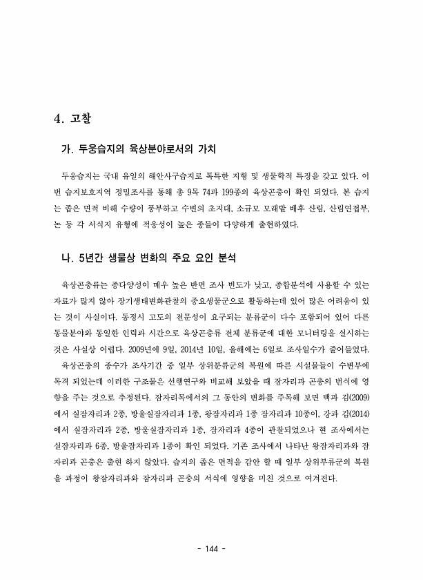 144 4. 고찰 가. 두웅습지의 육상분야로서의 가치 두웅습지는 국내 유일의 해안사구습지로 톡특한 지형 및 생물학적 특징을 갖고 있다. 이 번 습지보호지역 정밀조사를 통해 총 9목 74과 199종의 육상곤충이 확인 되었다. 본 습지 는 좁은 면적 비해 수량이 풍부하고 수변의 초지대, 소규모 모래밭 배후 산림, 산림연접부, 논 등 각 서식지 유형에 적응성이 높은 종들이 다양하게 출현하였다. 나. 5년간 생물상 변화의 주요 요인 분석 육상곤충류는 종다양성이 매우 높은 반면 조사 빈도가 낮고, 종합분석에 사용할 수 있는 자료가 많지 않아 장기생태변화관찰의 중요생물군으로 활동하는데 있어 많은 어려움이 있 는 것이 사실이다. 동정시 고도의 전문성이 요구되는 분류군이 다수 포함되어 있어 다른 동물분야와 동일한 인력과 ...