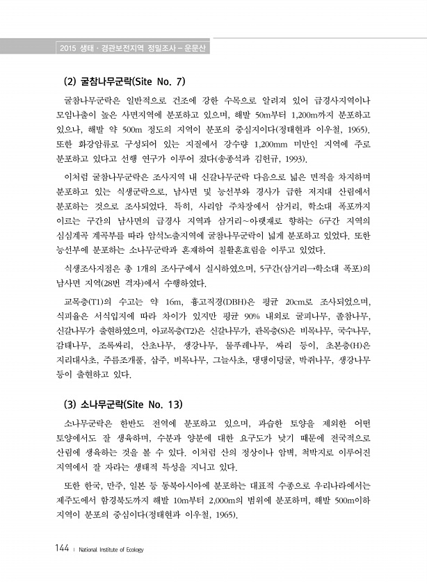2015 생태·경관보전지역 정밀조사 운문산 144 ? National Institute of Ecology 2 굴참나무군락 Site No. 7 굴참나무군락은 일반적으로 건조에 강한 수목으로 알려져 있어 급경사지역이나 모임나출이 높은 사면지역에 분포하고 있으며, 해발 50m부터 1,200m까지 분포하고 있으나, 해발 약 500m 정도의 지역이 분포의 중심지이다 정태현과 이우철, 1965 또한 화강암류로 구성되어 있는 지질에서 강수량 1,200mm 미만인 지역에 주로 분포하고 있다고 선행 연구가 이루어 졌다 송종석과 김헌규, 1993 이처럼 굴참나무군락은 조사지역 내 신갈나무군락 다음으로 넓은 면적을 차지하며 분포하고 있는 식생군락으로, 남사면 및 능선부와 경사가 급한 저지대 산림에서 분포하는 것으로 조사되었다...