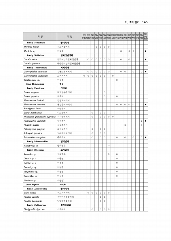 Ⅱ. 조사결과 145 학 명 국 명 1981 이등 1996 권등 2001 이등 2004 김등 2006 이등 2006 김등 2008 안등 2009 김등 2009 이외 2010 박외 2011 박외 2012 박외 2013 박외 2013 유등 2014 최등 2015 this study Family Mordellidae 꽃벼룩과 Mordella tokejii 긴꼬리꽃벼룩 ○ ○ ○ ○ Mordella sp. 미동정 ○ ○ ○ ● Family Nitidulidae 밑빠진벌레과 Omosita colon 점박이납작밑빠진벌레 ○ ○ ○ ○ ○ ○ ○ ○ ● Omosita japonica 구름무늬납작밑빠진벌레 ...