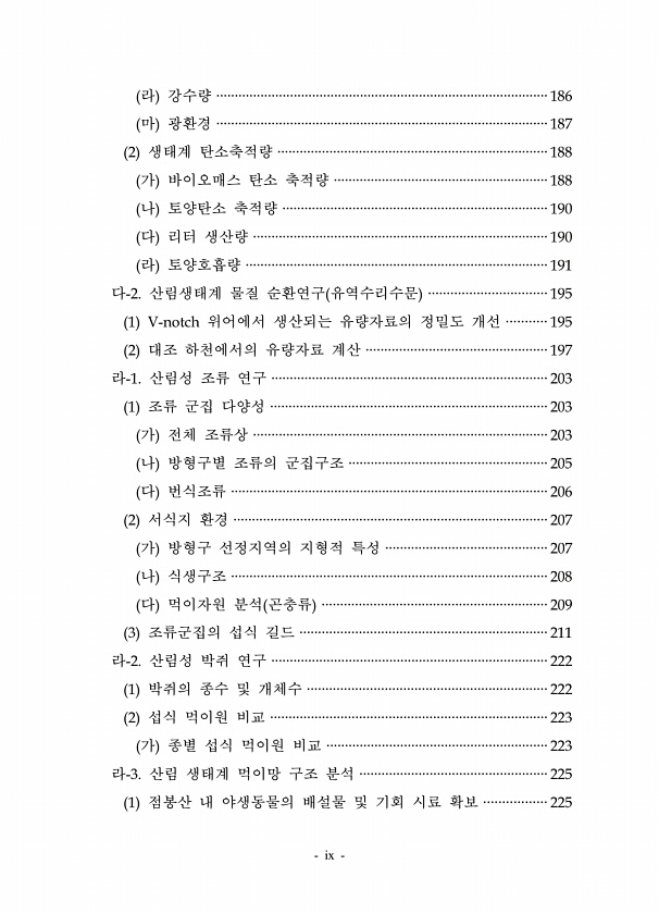 ix 라 강수량 ··························································································186 마 광환경 ··························································································187 2 생태계 탄소축적량 ·········································································188 가 바이오매스 탄소 축적량 ··························································188 나 토양탄소 축적량 ····················...