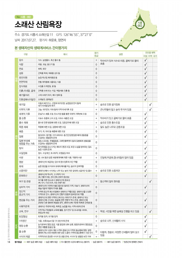 군산 001 No. 시흥 본 생태자산의 생태계서비스 간이평가지 구분 예시 평가 등급 설명 규모별 혜택 지점 지역 국가 공급 담수 식수, 농업용수, 축산 용수 등 + 약수터가 있어 식수로 이용, 골짜기로 물이 흐름 √ 식량 곡물, 과실, 물고기 등 0 √ 연료 화목, 토탄 0 √ 섬유 건축용 목재, 의류용 섬유 등 0 √ 유전자원 농업·축산업 희귀품종 등 0 √ 천연약재 전통 의약품에 사용되는 식물 0 √ 장식재료 수집용 조개껍질, 꽃 등 0 √ 진흙,미네랄, 골재 건축용 모래 또는 자갈, 벽돌재료 진흙 등 0 √ 폐기물처리 고체 쓰레기 하치, 폐수 방류 등 0 √ 친환경에너지발전 조력발전, 풍력발전 0 √ 조절 대기질 자동차 배기가스, 산업체 대기오염, 농업발생 먼지 등의 대기 미세물질의 제거 + 숲으로 인...