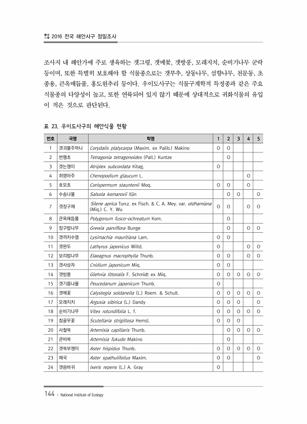 2016 전국 해안사구 정밀조사 144 ? National Institute of Ecology 번호 국명 학명 1 2 3 4 5 1 갯괴불주머니 Corydalis platycarpa Maxim. ex Palib. Makino O O 2 번행초 Tetragonia tetragonoides Pall. Kuntze O 3 갯는쟁이 Atriplex subcordata Kitag. O 4 취명아주 Chenopodium glaucum L. O 5 호모초 Corispermum stauntonii Moq. O O O 6 수송나물 Salsola komarovii Iljin O O O 7 갯장구채 Silene aprica Turcz. ex Fisch. & C. A. Mey. var. oldhamiana Miq. C. Y. ...