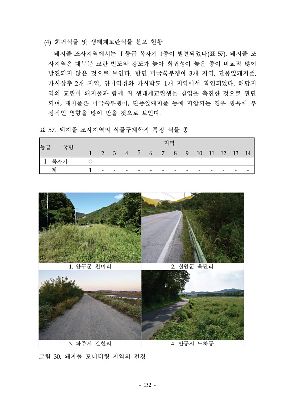 132 4 희귀식물 및 생태계교란식물 분포 현황 돼지풀 조사지역에서는 Ⅰ등급 복자기 1종이 발견되었다 표 57 돼지풀 조 사지역은 대부분 교란 빈도와 강도가 높아 희귀성이 높은 종이 비교적 많이 발견되지 않은 것으로 보인다. 반면 미국쑥부쟁이 3개 지역, 단풍잎돼지풀, 가시상추 2개 지역, 양미역취와 가시박도 1개 지역에서 확인되었다. 해당지 역의 교란이 돼지풀과 함께 위 생태계교란생물 침입을 촉진한 것으로 판단 되며, 돼지풀은 미국쑥부쟁이, 단풍잎돼지풀 등에 피압되는 경우 생육에 부 정적인 영향을 많이 받을 것으로 보인다. 등급 국명 지역 1 2 3 4 5 6 7 8 9 10 11 12 13 14 Ⅰ 복자기 ○ 계 1 표 57. 돼지풀 조사지역의 식물구계학적 특정 식물 종 1. 양구군 천미리 2. 철원군 ...