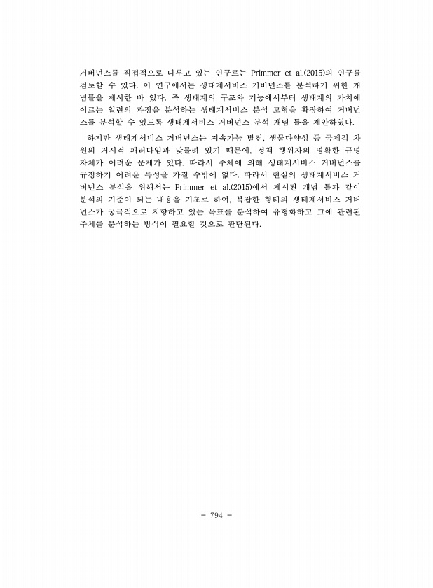 794 거버넌스를 직접적으로 다루고 있는 연구로는 Primmer et al. 2015 의 연구를 검토할 수 있다. 이 연구에서는 생태계서비스 거버넌스를 분석하기 위한 개 념틀을 제시한 바 있다. 즉 생태계의 구조와 기능에서부터 생태계의 가치에 이르는 일련의 과정을 분석하는 생태계서비스 분석 모형을 확장하여 거버넌 스를 분석할 수 있도록 생태계서비스 거버넌스 분석 개념 틀을 제안하였다. 하지만 생태계서비스 거버넌스는 지속가능 발전, 생물다양성 등 국제적 차 원의 거시적 패러다임과 맞물려 있기 때문에, 정책 행위자의 명확한 규명 자체가 어려운 문제가 있다. 따라서 주체에 의해 생태계서비스 거버넌스를 규정하기 어려운 특성을 가질 수밖에 없다. 따라서 현실의 생태계서비스 거 버넌스 분석을 위해서는 Primmer e...