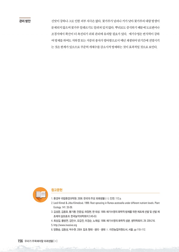 156 우리가 주목해야할 외래생물 [Ⅰ] 참고문헌 1. 환경부 국립환경과학원. 2008. 한국의 주요 외래생물 Ⅰ 인천. 112 p. 2. Leo? Klime? & Jitka Klime?ov?. 1999. Root sprouting in Rumex acetosella under different nutrient levels. Plant Ecology. 14133-39. 3. 김성문, 김용호, 황기환, 안문섭, 허장현, 한 대성. 1999. 애기수영의 화학적 방제를 위한 제초제 선발 및 선발 제 초제의 살초효과. 한국농약과학회지 345-53. 4. 최상길, 황방연, 김민수, 오갑진, 이경순, 노재섭. 1998. 애기수영의 화학적 성분. 생약학회지. 29209-216. 5. http//www.invasive.o...