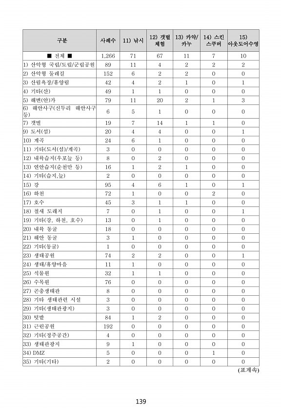 139 구분 사례수 11 낚시 12 갯벌 체험 13 카약/ 카누 14 스킨 스쿠버 15 아웃도어수영 ■ 전체 ■ 1,266 71 67 11 7 10 1 산악형 국립/도립/군립공원 89 11 4 2 2 2 2 산악형 둘레길 152 6 2 2 0 0 3 산림욕장/휴양림 42 4 2 1 0 1 4 기타 산 49 1 1 0 0 0 5 해변 안 가 79 11 20 2 1 3 6 해안사구 신두리 해안사구 등 6 5 1 0 0 0 7 갯벌 19 7 14 1 1 0 9 도서 섬 20 4 4 0 0 1 10 계곡 24 6 1 0 0 0 11 기타 도서 섬 /계곡 3 0 0 0 0 0 12 내륙습지 우포늪 등 8 0 2 0 0 0 13 연안습지 순천만 등 16 1 2 1 0 0 14 기타 습지,늪 2 0 0 0 0 0 15 ...