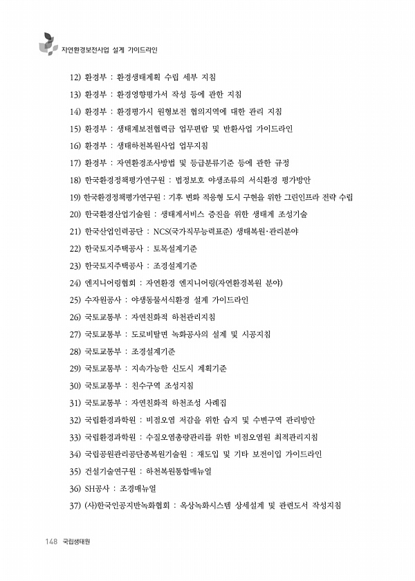 148 국립생태원 자연환경보전사업 설계 가이드라인 12 환경부 환경생태계획 수립 세부 지침 13 환경부 환경영향평가서 작성 등에 관한 지침 14 환경부 환경평가시 원형보전 협의지역에 대한 관리 지침 15 환경부 생태계보전협력금 업무편람 및 반환사업 가이드라인 16 환경부 생태하천복원사업 업무지침 17 환경부 자연환경조사방법 및 등급분류기준 등에 관한 규정 18 한국환경정책평가연구원 법정보호 야생조류의 서식환경 평가방안 19 한국환경정책평가연구원 기후 변화 적응형 도시 구현을 위한 그린인프라 전략 수립 20 한국환경산업기술원 생태계서비스 증진을 위한 생태계 조성기술 21 한국산업인력공단 NCS 국가직무능력표준 생태복원?관리분야 22 한국토지주택공사 토목설계기준 23 한국토지주택공사 조경설계기준 24 엔지니어링...