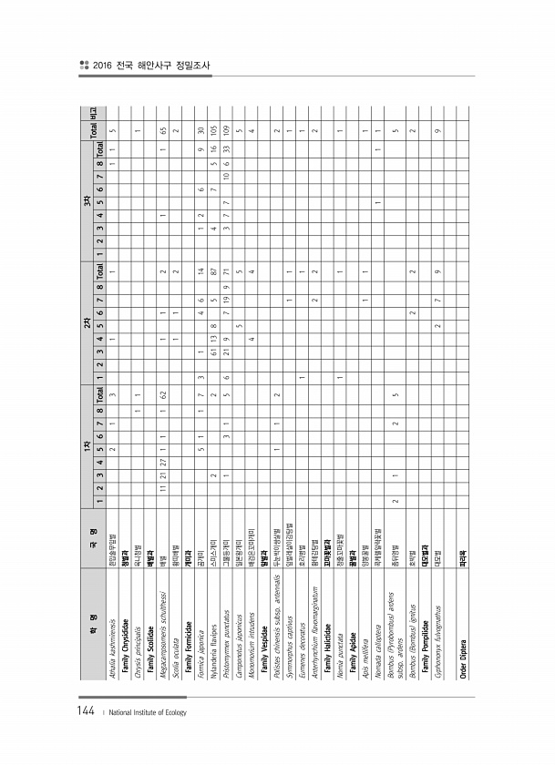 144 학 명 국 명 1차 2차 3차 Total 비고 1 2 3 4 5 6 7 8 Total 1 2 3 4 5 6 7 8 Total 1 2 3 4 5 6 7 8 Total Athalia kashmirensis 흰입술무잎벌 2 1 3 1 1 1 1 5 Family Chrysididae 청벌과 Chrysis principalis 육니청벌 1 1 1 Family Scoliidae 배벌과 Megacampsomeris schulthessi 배벌 11 21 27 1 1 1 62 1 1 2 1 1 65 Scolia oculata 황띠배벌 1 1 2 2 Family Formicidae 개미과 Formica japonica 곰개미 5 1 1 7 3 1 4 6 14 1 2 6 9 30 Nylanderia flavipes 스미...