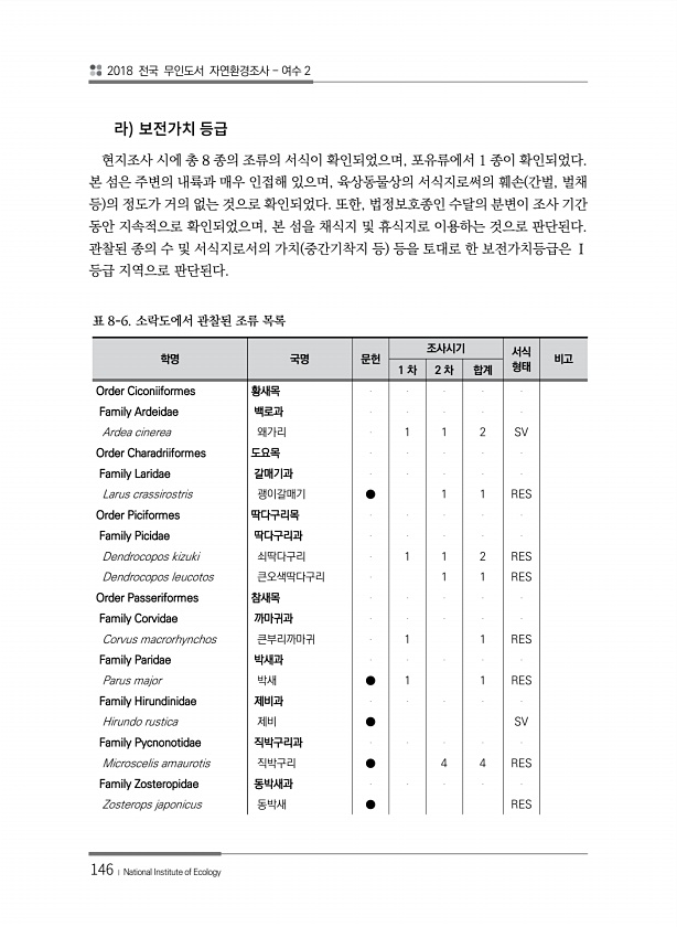2018 전국 무인도서 자연환경조사 여수 2 146 ? National Institute of Ecology 현지조사 시에 총 8 종의 조류의 서식이 확인되었으며, 포유류에서 1 종이 확인되었다. 본 섬은 주변의 내륙과 매우 인접해 있으며, 육상동물상의 서식지로써의 훼손 간벌, 벌채 등 의 정도가 거의 없는 것으로 확인되었다. 또한, 법정보호종인 수달의 분변이 조사 기간 동안 지속적으로 확인되었으며, 본 섬을 채식지 및 휴식지로 이용하는 것으로 판단된다. 관찰된 종의 수 및 서식지로서의 가치 중간기착지 등 등을 토대로 한 보전가치등급은 Ⅰ 등급 지역으로 판단된다. 학명 국명 문헌 조사시기 서식 1 차 2 차 합계 형태 비고 Order Ciconiiformes 황새목 Family Ardeidae 백로과 Ard...