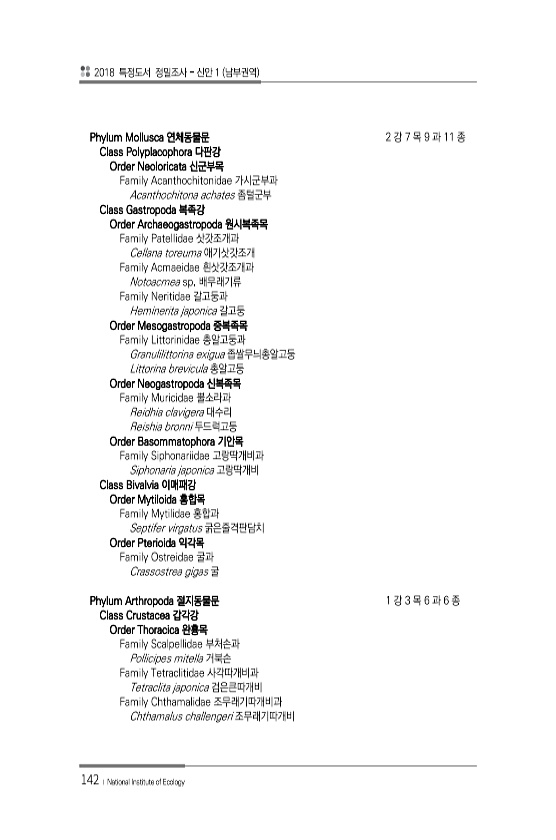 2018 특정도서 정밀조사 신안 1 남부권역 142 ? National Institute of Ecology Phylum Mollusca 연체동물문 2 강 7 목 9 과 11 종 Class Polyplacophora 다판강 Order Neoloricata 신군부목 Family Acanthochitonidae 가시군부과 Acanthochitona achates 좀털군부 Class Gastropoda 복족강 Order Archaeogastropoda 원시복족목 Family Patellidae 삿갓조개과 Cellana toreuma 애기삿갓조개 Family Acmaeidae 흰삿갓조개과 Notoacmea sp. 배무래기류 Family Neritidae 갈고둥과 Heminerita japonica 갈고둥 Order...